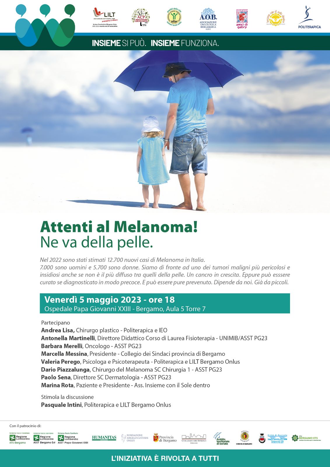 Il 5 maggio, è in programma un incontro/convegno all’Ospedale Papa Giovanni XXIII di Bergamo, aula 5, torre 7. L’evento si tiene in presenza e in diretta streaming. Due ore di chiacchierata per parlare del Melanoma da diversi punti di vista: medico, psicologico, umano, sociale. Tra i contributi è previsto quello di una paziente.