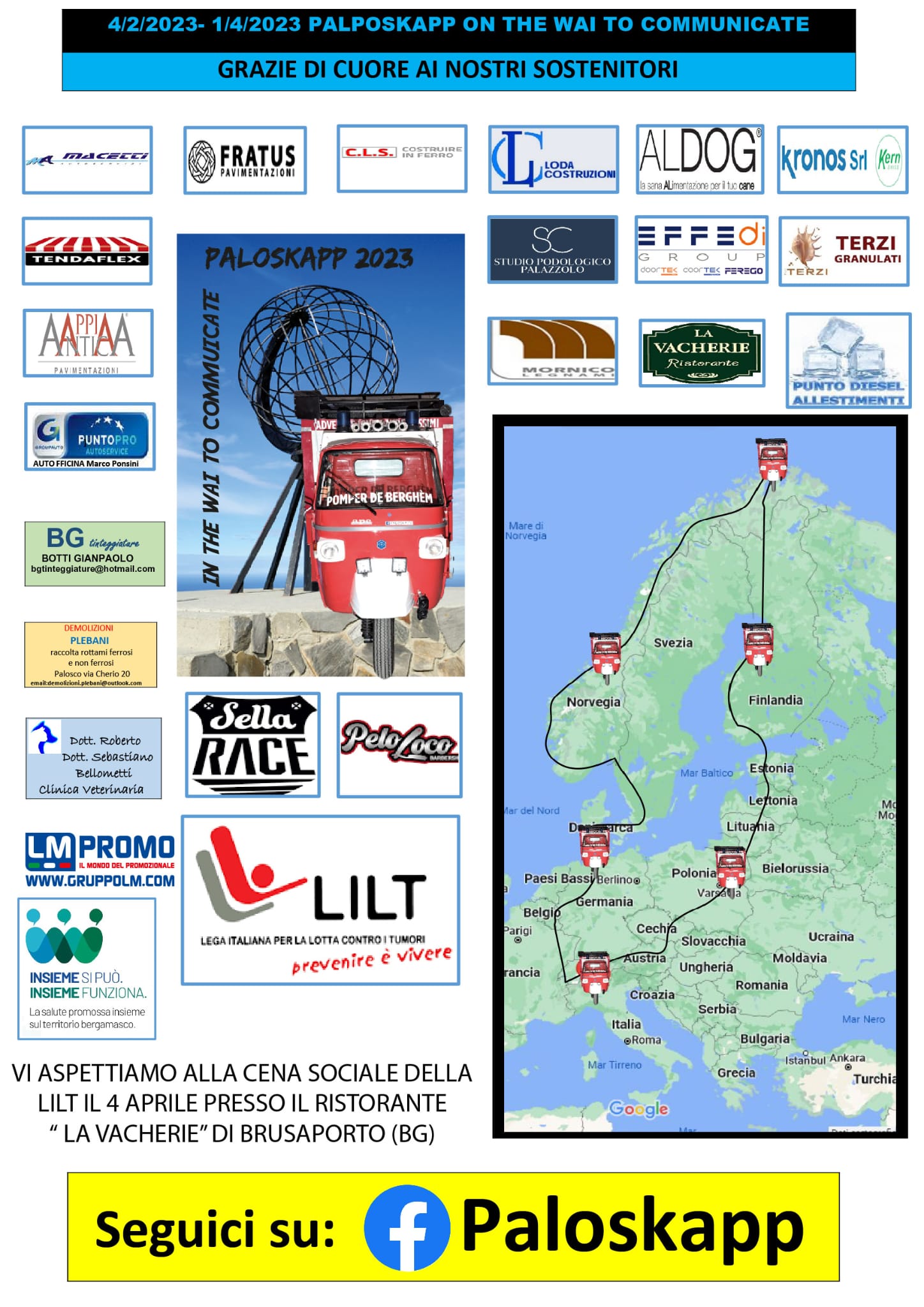 Dovevamo aspettarcelo: dopo l’impresa del 2018 con “Aperitivointour”, un viaggio di 7000 Km per tutta l’Italia, per parlare di prevenzione visitando le diverse sedi LILT e le caserme dei Vigili del Fuoco suoi colleghi, ecco il nostro Sergio Cascio con una nuova proposta: un’ avventura fino a Capo Nord, con il piccolo Apecar, opportunamente attrezzato, ma pur sempre un Apecar, viaggio al quale ha dato il suo patrocinio anche la LILT Nazionale. Al suo arrivo consegnerà alle autorità locali una copia del libro del Centenario di LILT Nazionale e una copia dei 90 anni di LILT Bergamo Onlus.
