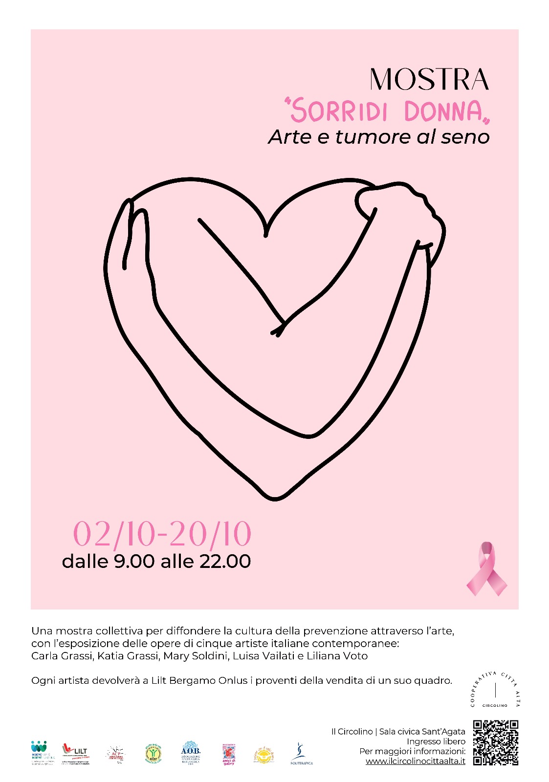 La mostra “Sorridi Donna” è dedicata a tutte le donne, alla bellezza, alla salute; le artiste hanno deciso di offrire 5 quadri per raccogliere fondi a favore di LILT Bergamo Onlus. Vi aspettiamo dalle 16.30 alle 19.00 fino al 20 ottobre! Un grandissimo GRAZIE al Circolino di Città Alta che ci ha accolti nella prestigiosa struttura di S. Agata!
