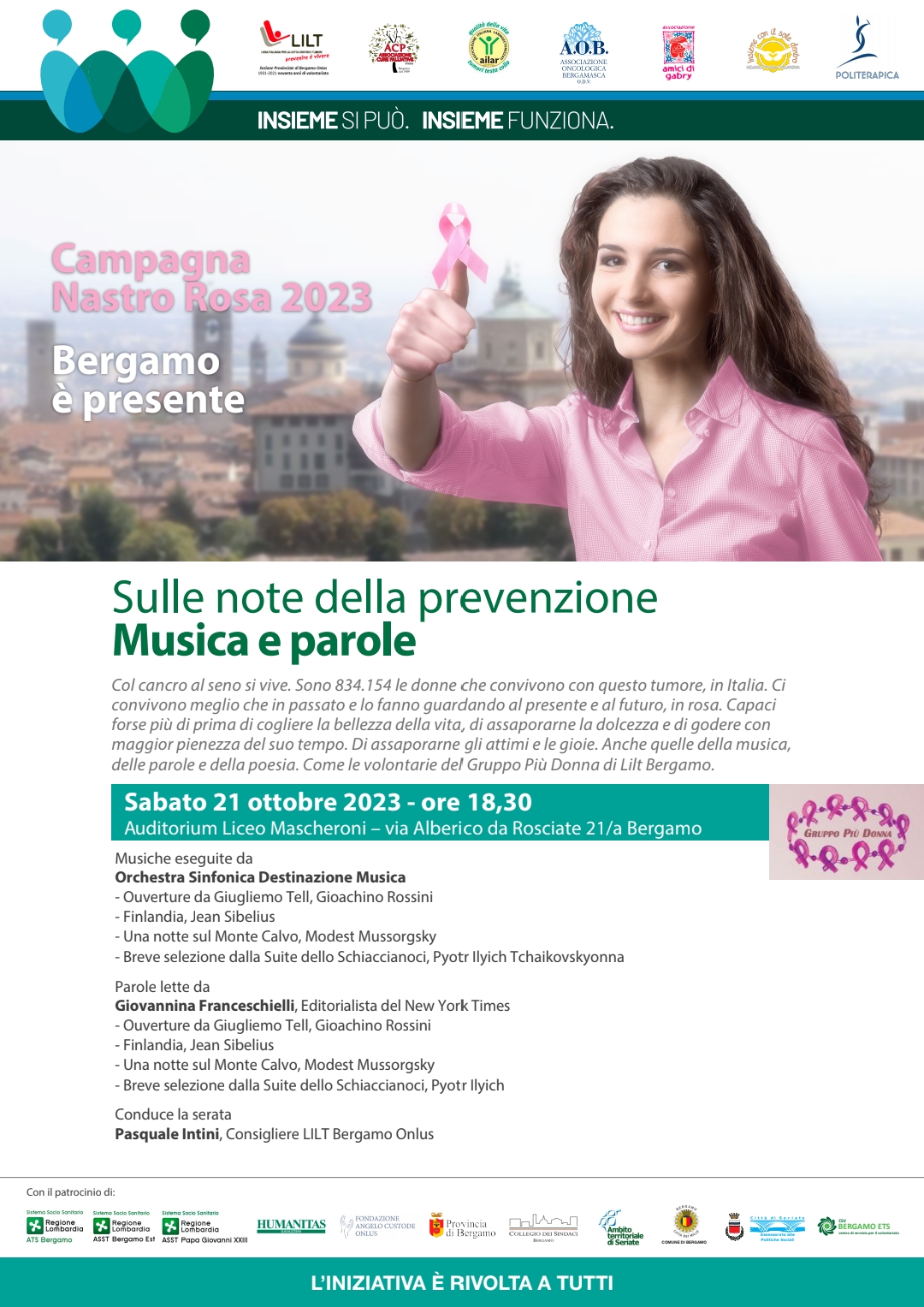 Per proseguire il nostro viaggio in “rosa” e nella bellezza e nella salute, sabato 21 ottobre alle 18.30, presso l’auditorium del liceo Mascheroni, in via Alberico da Rosciate a Bergamo si terrà lo spettacolo “Sulle note della prevenzione. Musica e parole”, con l’orchestra sinfonica “Destinazione Musica”. L’ingresso è gratuito.