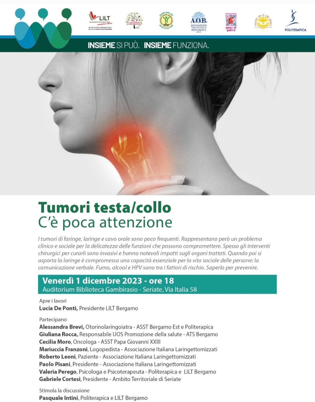 1 dicembre presso l’Auditorium Biblioteca Gambirasio di Seriate alle 18.30 ultimo appuntamento di “Insieme si può. Insieme funziona” sui tumori testa-collo