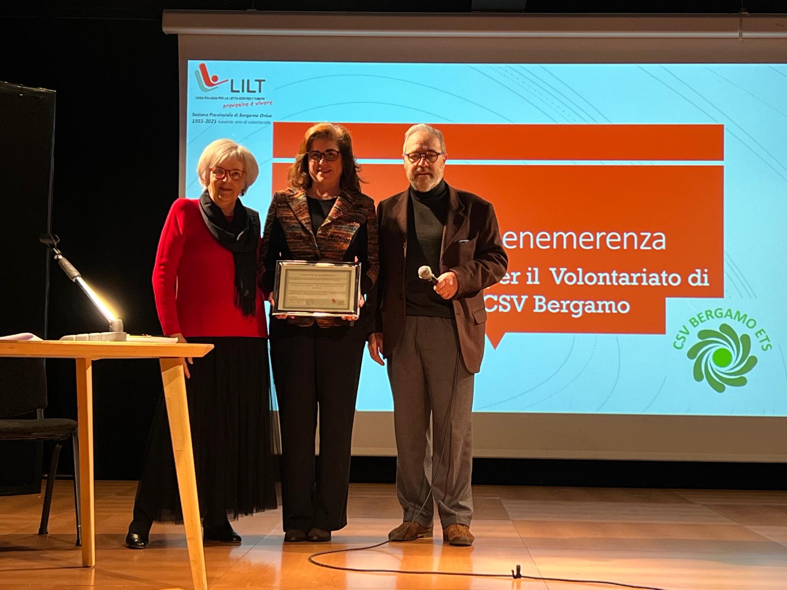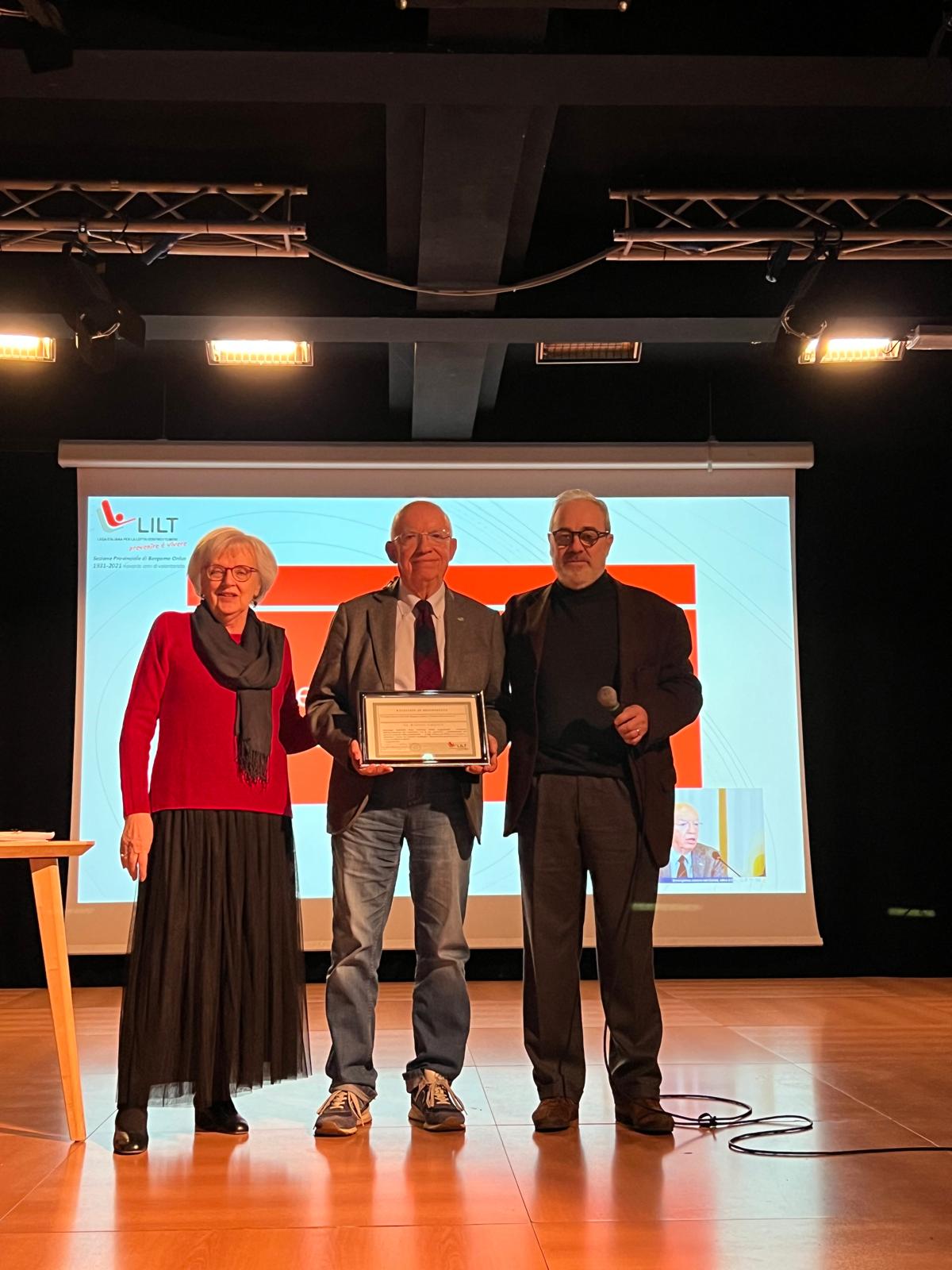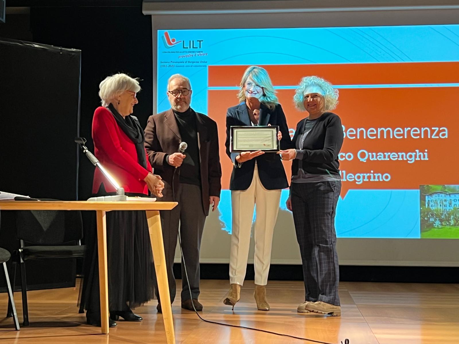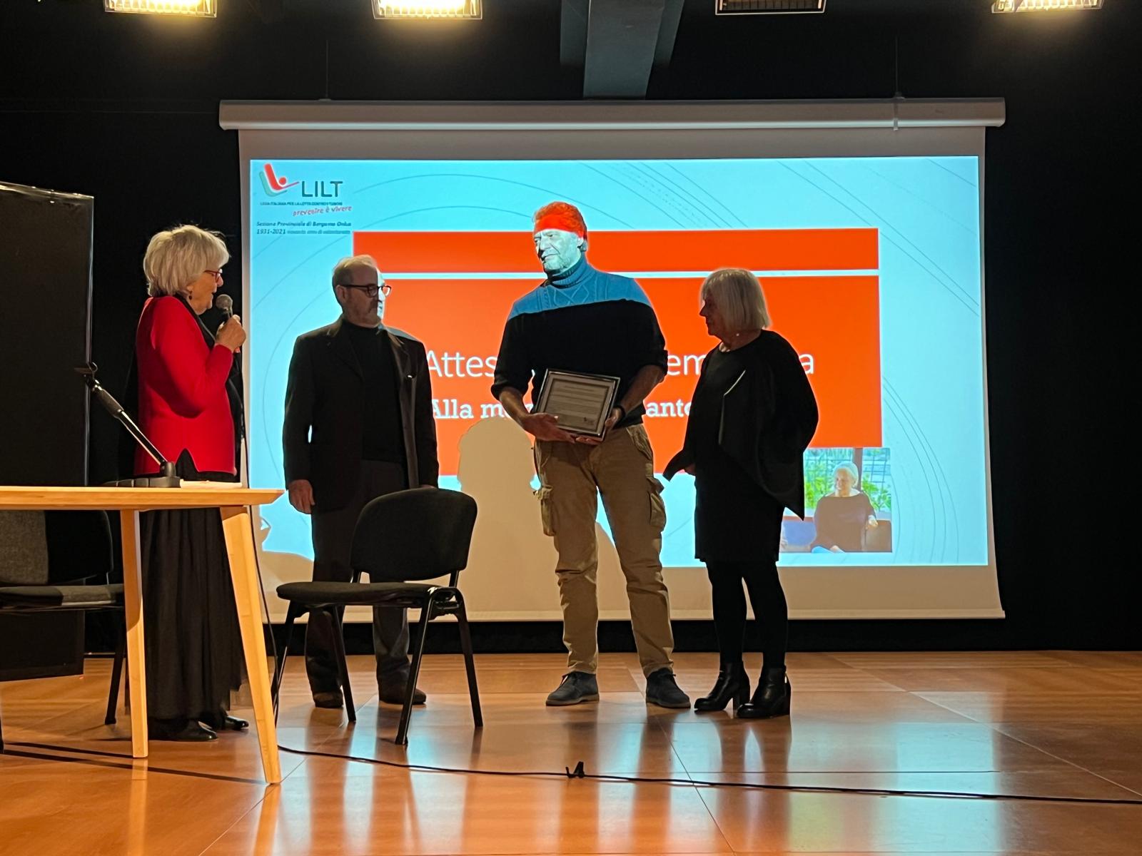 Sono poi state consegnate le benemerenze : al dr. Roberto Labianca, oncologo, referente scientifico dell’Associazione, alla memoria di Santo Ghisleni, compianto volontario responsabile della contabilità dell’associazione, fino all’ultimo periodo di malattia, al centro Servizi del Volontariato, per la proposta formativa varie e eterogenea, che ha coinvolto molti volontari e per l’assistenza professionale costantemente a disposizione, all’Istituto Clinico Quarenghi di San Pellegrino e alla Fondazione Sant’Andrea di Clusone per la disponibilità a ospitare le iniziative di prevenzione di LILT.